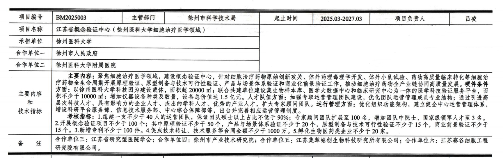 近日,江苏省财政厅、江苏省科学技术厅联合印发《关于下达2025年省基础研究专项资金(重大创新平台计划第三批)的通知》,由我校资产经营公司牵头组织的徐州医科大学细胞治疗医学概念验证中心成功获批省级概念验证中心,这是我校在科技成果转化平台建设领域取得的重大突破,也是资产经营公司主动服务学校科技创新与地方产业发展的重要成果。