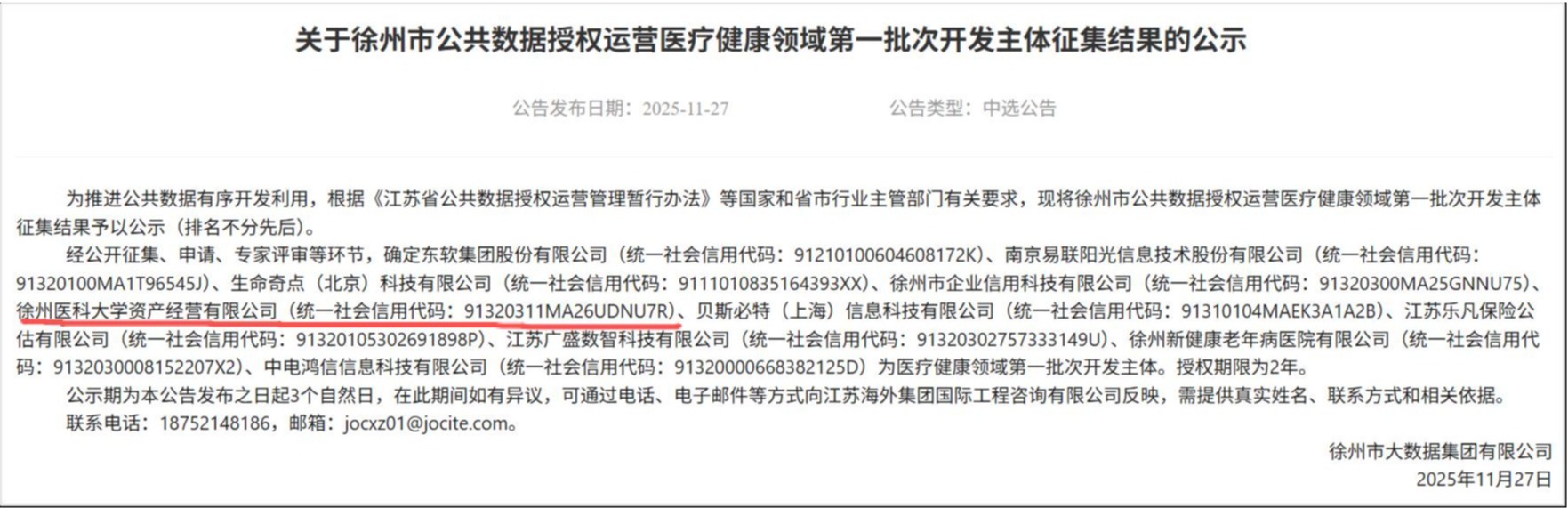 近期,徐州市大数据集团发布《关于徐州市公共数据授权运营医疗健康领域第一批次开发主体征集结果的公示》,经公开征集、申请、专家评审等环节,徐州医科大学资产经营有限公司获批徐州市公共数据授权运营医疗健康领域第一批次开发主体,标志着资产公司在数据要素新质生产力培育上迈出坚实的一步。