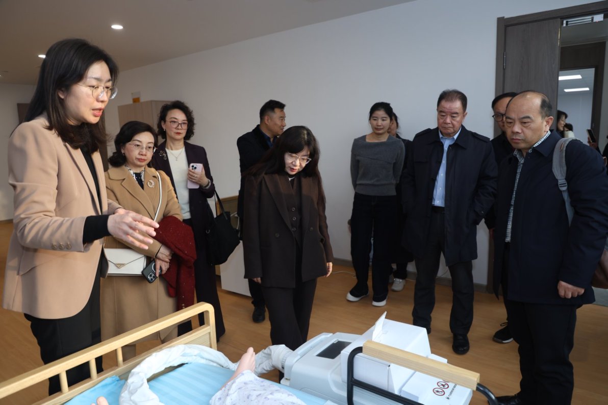 会议期间,国家科技部2030“四大慢病重大专项”课题组组长教育部高等学校护理学类专业教学指导委员会秘书长孙宏玉,原天津中医药大学党委常委、副校长王耀刚,四川大学智慧医疗健康管理创新研究中心主任罗利,北京安贞医院内分泌代谢科主任周迎生,遵义医科大学护理学院院长邓仁丽,中国康复研究中心科研处处长卢守四,徐州医科大学护理学院院长周芳及各课题组成员参观未来产业科技园。周芳在序厅介绍了智慧健康管理产业学院建设情况,课题组成员重点考察人才培训场景、慢病大数据监测中心、康复护理研发中心等核心区域。