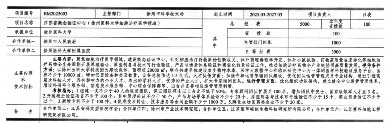 近日,江苏省财政厅、江苏省科学技术厅联合印发《关于下达2025年省基础研究专项资金(重大创新平台计划第三批)的通知》,由我校资产经营公司牵头组织的徐州医科大学细胞治疗医学概念验证中心成功获批省级概念验证中心,这是我校在科技成果转化平台建设领域取得的重大突破,也是资产经营公司主动服务学校科技创新与地方产业发展的重要成果。
