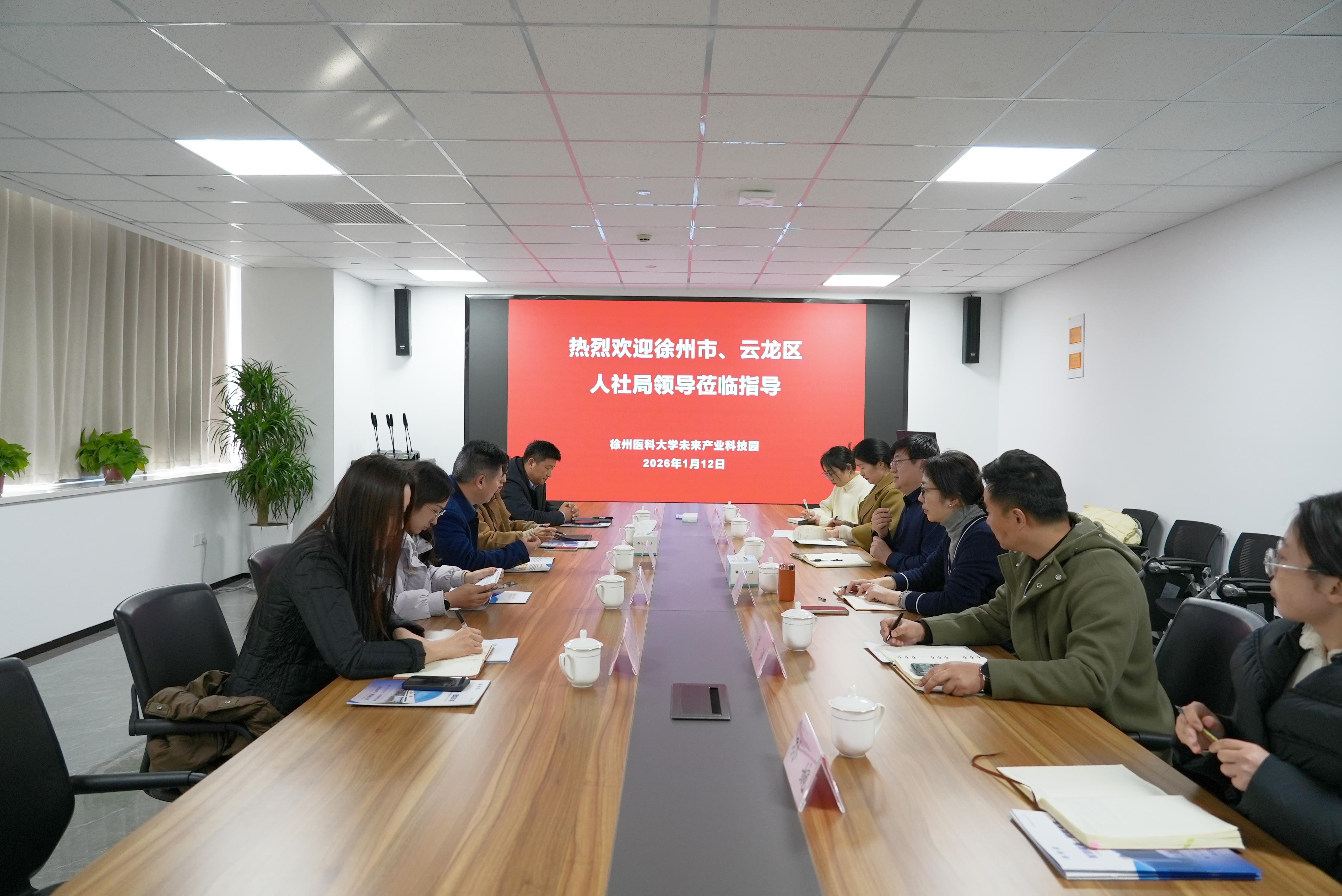 1月12日下午,徐州市人社局谢辉处长、云龙区人社局李燕局长一行考察未来产业科技园并座谈交流。资产公司总经理轩萱、护理学院院长周芳及相关人员参加活动,会议由轩萱主持。