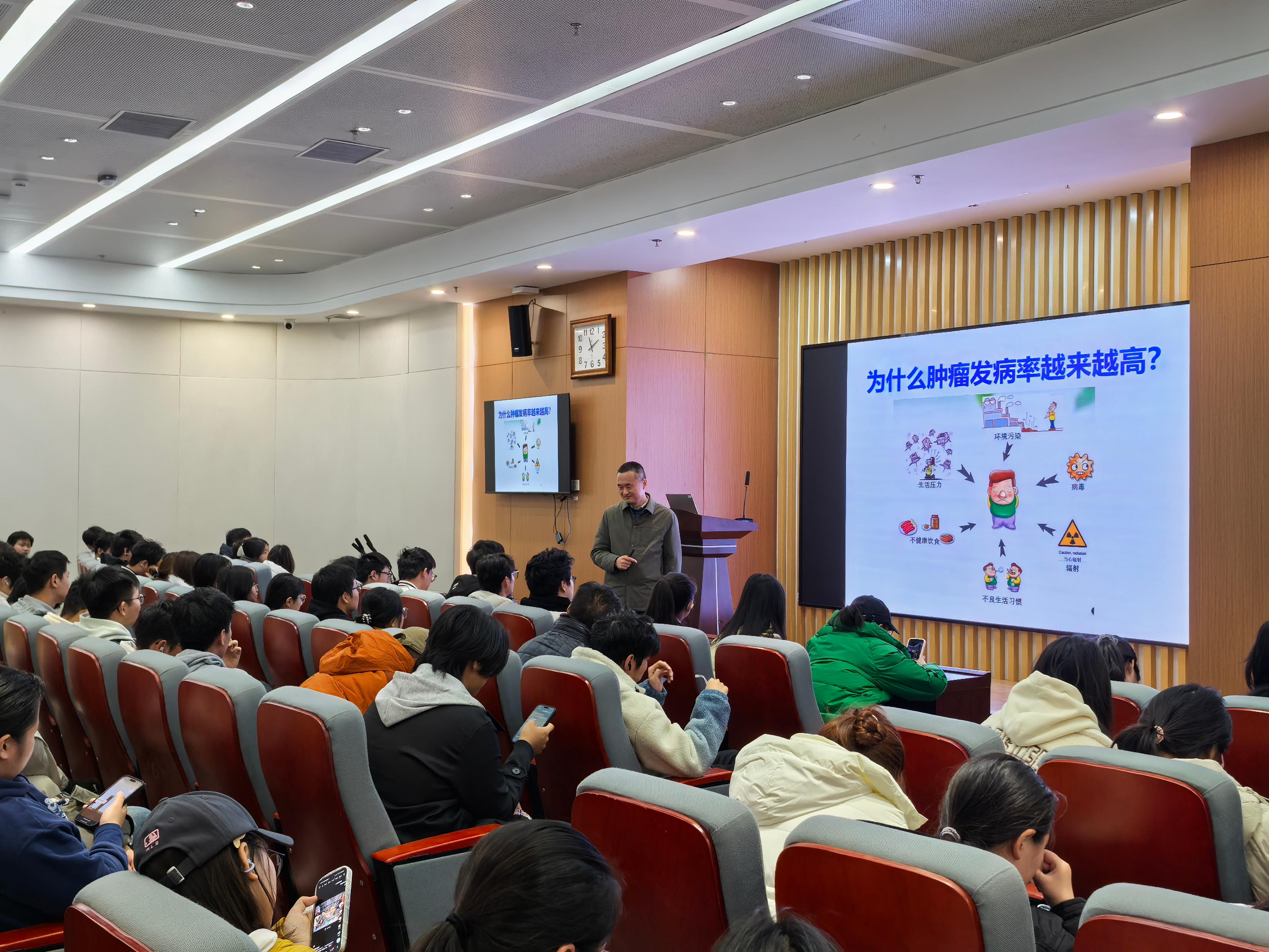 施教授首先通过启发式互动,引导学生深入探讨创新创业在生物医药领域的核心价值,并系统阐释了研究所在细胞治疗药物研发中的战略规划与创新突破;随后,在施教授的带领下,师生们来到GMP无菌生产中心外,通过透明玻璃墙,清晰地观察到细胞培养、提取与质控等关键生产环节,深入了解细胞治疗药物从实验室研究到产业化生产的完整路径;在专题报告环节,施教授以“从免疫治疗看创新创业”为主题,结合自身科研与创业实践经验,深入分析了当前细胞治疗行业的发展趋势、技术瓶颈与市场机遇,激励学生立足学科前沿,勇于探索实践。